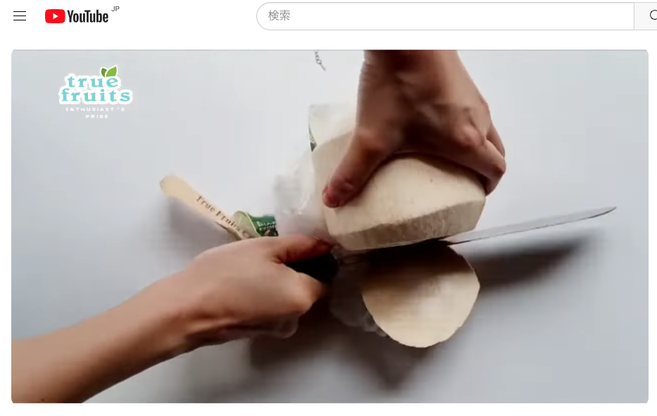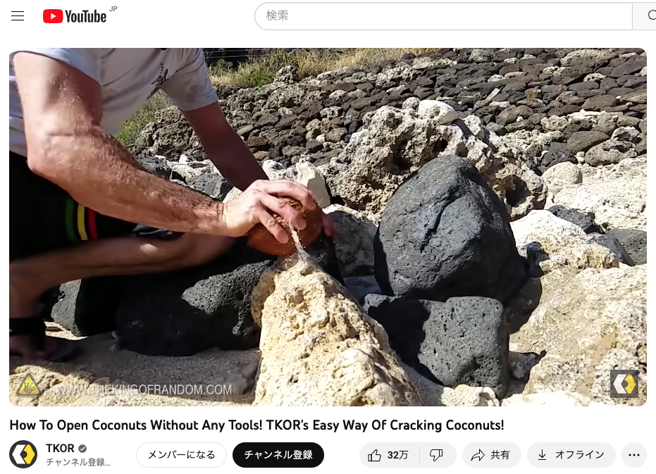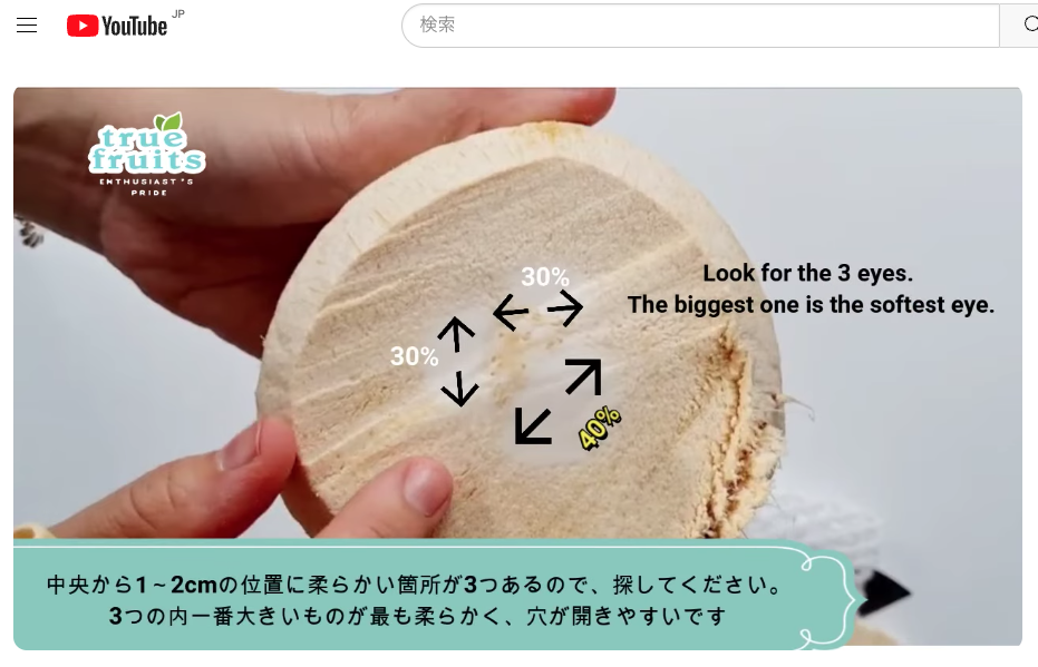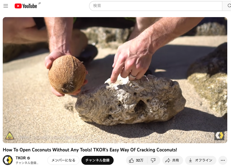 この動画では、道具無しで「ココナッツ」(今回のヤングココナッツではなく、オールドココナッツですが参考になります。)をきれいに割っていました。
