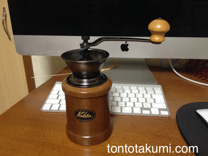 出来上がった珈琲豆は、以前、お義母さんにプレゼントしてもらった「Kalita(カリタ)のコーヒーミル」で挽いて飲んでみます。